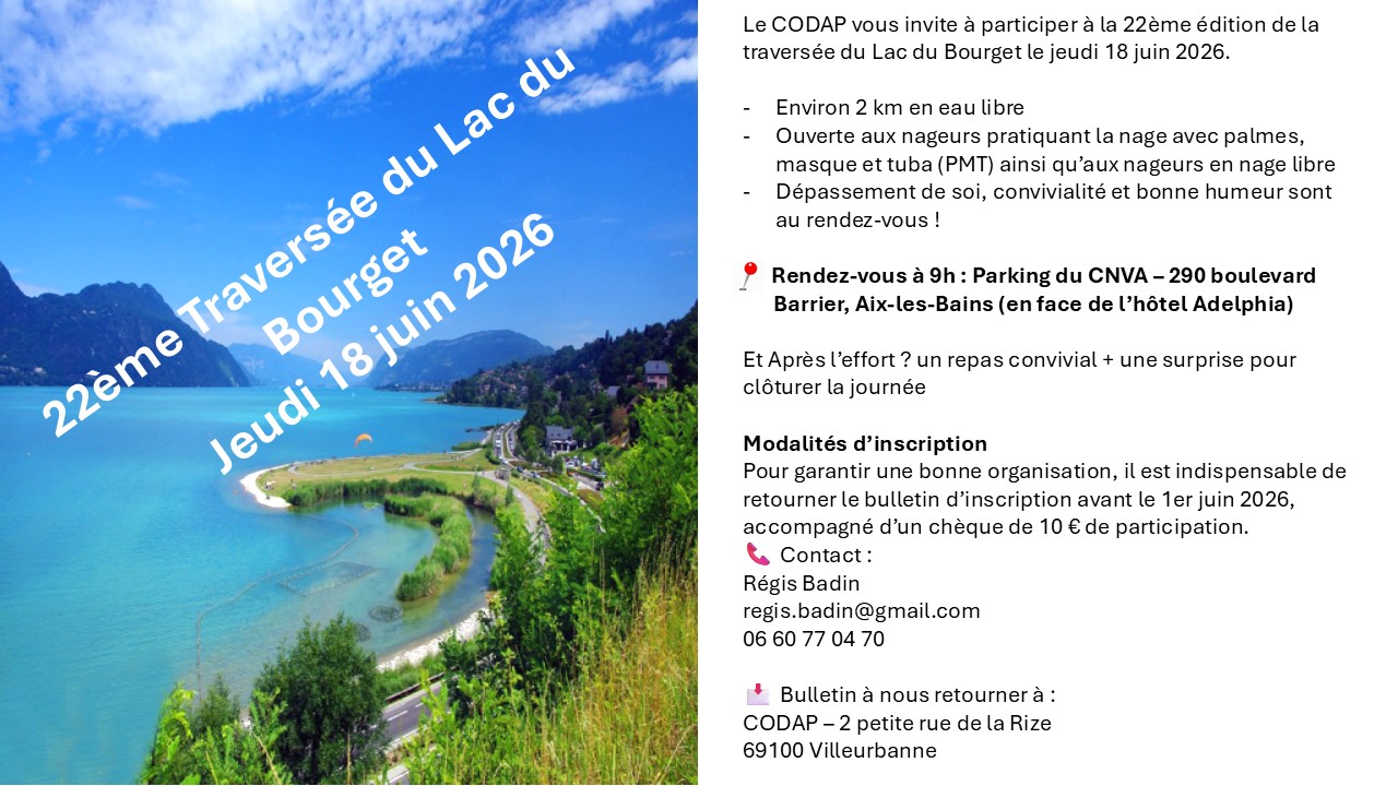 Le CODAP vous donne rendez-vous pour la 22ème édition de la traversée du Lac du Bourget, qui se déroulera le jeudi 18 juin 2026.