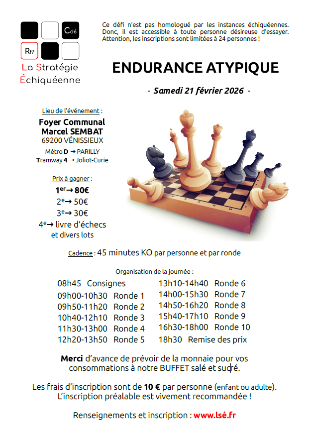 Envie de relever un défi échiquéen hors du commun ? Le samedi 21 février 2026, la Stratégie Échiquéenne vous propose Endurance Atypique, un tournoi d’échecs intense et original, pensé pour celles et ceux qui aiment aller au bout d’eux-mêmes derrière l’échiquier.