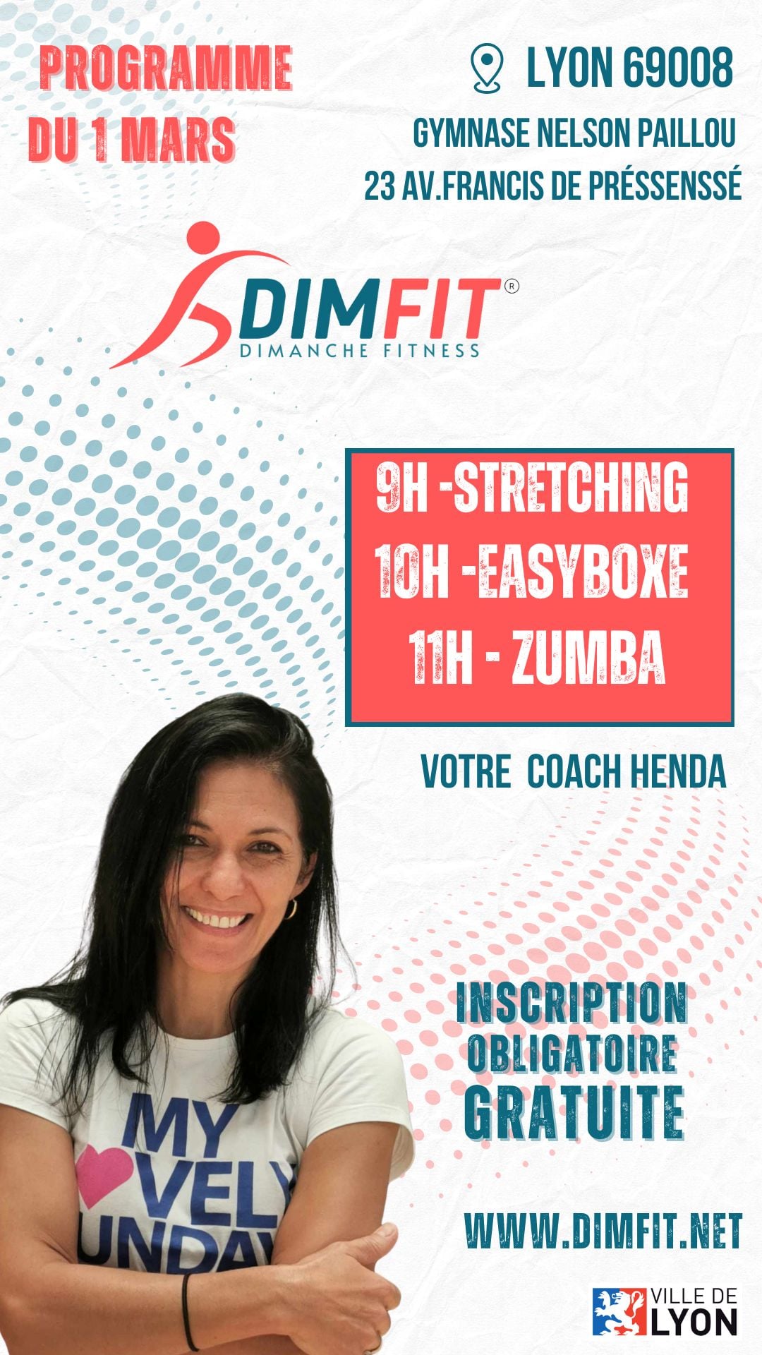 Comme tous les dimanches matins, DimFit Lyon vous invite le dimanche 1er mars de 9h à 12h à une matinée fitness ouverte à toutes et tous, placée sous le signe du partage et du bien-être avec votre coach Henda.