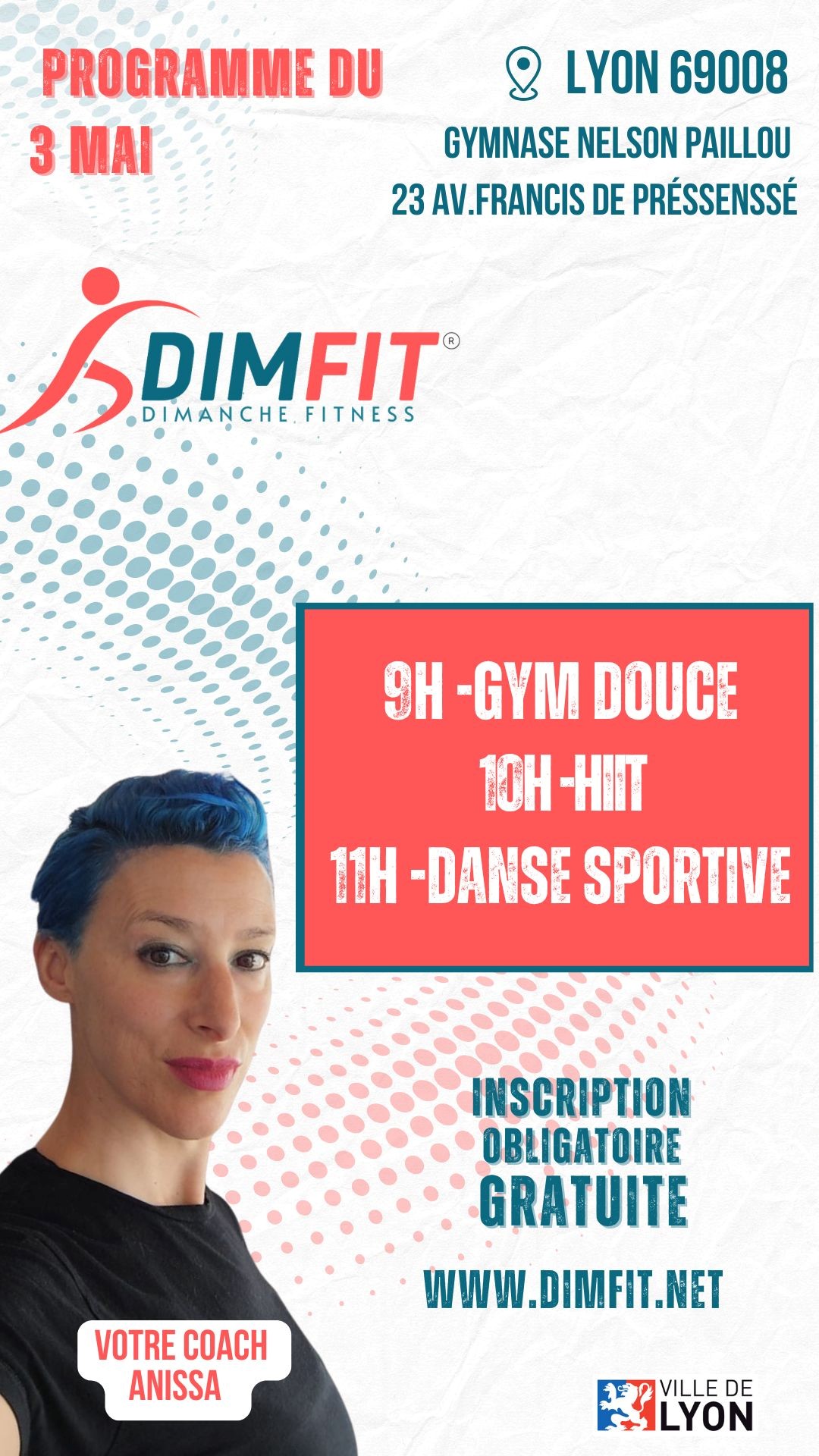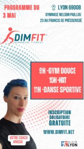 Comme tous les dimanches matins, DimFit Lyon vous invite le dimanche 3 mai de 9h à 12h à une matinée fitness ouverte à toutes et tous, placée sous le signe du partage et du bien-être avec votre coach Anissa.