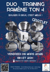 Le vendredi 6 mars 2026, le Cercle Bellecombe Lyon organise "Duo Training - Ramène ton +1", une séance de circuit training en duo, accessible aussi bien aux adhérents de l'association qu'aux externes.